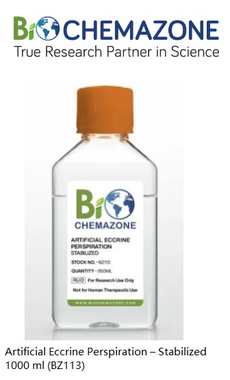 Artificial Eccrine Perspiration has a pH of 4.5 (we customize the pH on request without any additional cost, our artificial Eccrine Perspiration consists of amino acids, minerals, and various metabolites which simulates the composition, properties, and pH of the real Human eccrine sweat at Low price. We add preservatives, stabilizers, antifungal, and antibacterial reagents to enhance the shelf life. Please request it while making the order