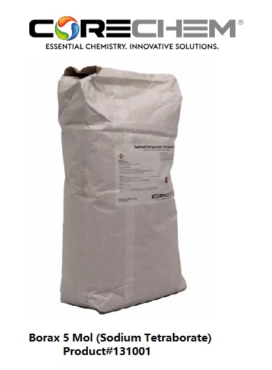 Borax 5 Mol (Sodium Tetraborate Pentahydrate) appears as white granules with no appreciable odor. It is a mineral and salt of boric acid. It is soluble in water. CORECHEM is a supplier/distributor of Borax in bulk package sizes. Buy Borax in bags and pallets. Also available: