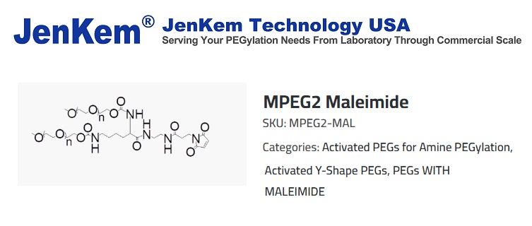 MPEG2 Maleimide reacts with thiol groups on cystein side chains, such as those present on the active ingredient of certolizumab [1]. JenKem Technology offers MPEG2 Maleimide with MW 40000, in 1g and 10g packing sizes. Different MW of MPEG2 Maleimide products may be available by custom synthesis, please email us at tech@jenkemusa.com for details on made-to-order PEGs. JenKem Technology provides repackaging services for an additional fee, please contact us if you require a different package size than our catalog selection.