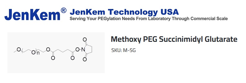Methoxy PEG Succinimidyl Glutarate (Methoxy PEG SG) is a high quality amine reactive methyl ether NHS PEG product from JenKem Technology. Methoxy PEG SG is a degradable PEG with a cleavable ester linker between the PEG polymeric chain and the NHS ester. Linear NHS PEGs with a Cleavable Linker (degradable PEGs) are especially employed in controlled release drug development applications. Methoxy PEG Succinimidyl Glutarate reacts with the amine group of lysine(s) at pH 7-8, while the ester linkage is cleaved under regular ester cleaving reaction conditions. Methoxy PEG Succinimidyl Glutarate has a slightly longer hydrolysis half life compared to Methoxy PEG Succinimidyl Succinate. JenKem Technology offers Methoxy PEG SG with MW 5000 Da (M-SG-5000) and MW 20000 Da (M-SG-20K), in 1g and 10g packing sizes.