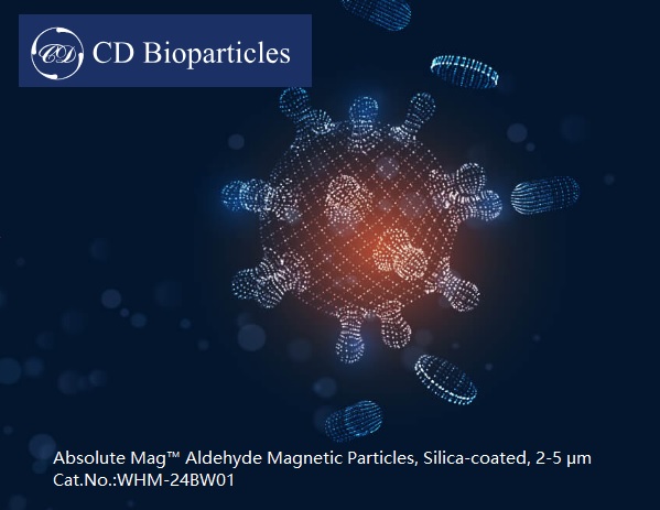 Absolute Mag™ Aldehyde Magnetic Particles, Silica-coated, 2-5 μm (#WHM-24BW01) are silica-coated magnetic particles with an aldehyde surface group. It is widely used to covalently couple ligands containing primary and secondary amino groups. pH Stability: 3-9.
