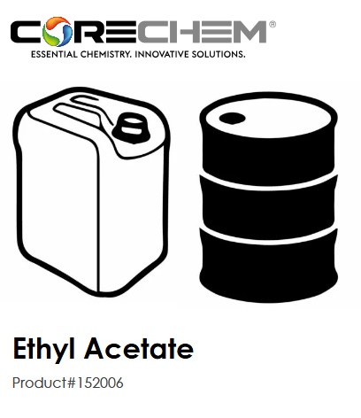 Ethyl Acetate is an organic compound that is the ester of Ethanol and Acetic Acid. It is generally used as a solvent and diluent. It appears as a colorless liquid and has a fruity odor. It may be favored for use due to its low toxicity and agreeable odor. It is soluble in chloroform, alcohol, and ether, and slightly soluble in water. CORECHEM is a supplier of this product in bulk package sizes. Buy Ethyl Acetate solvent in pails or drums.