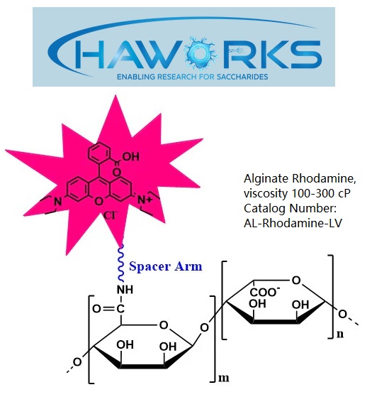 Description: Alginate is labeled with Rhodamine, Ex/Em wavelength 552/575 nm. Degree of substitution: 1.0 MOL % substitution or please contact Custom Service for higher Degree of Substitution (DoS) and Alginate labeled with other types of fluorescent dyes or biomolecular probes.