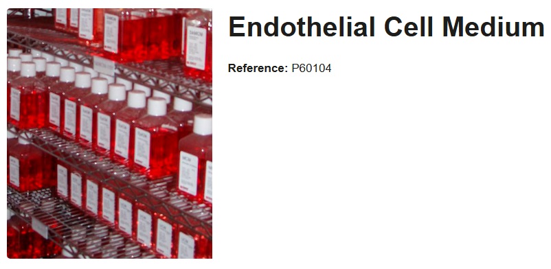 Endothelial cell medium (ECM) is a complete medium designed for optimal growth of normal primary microvascular endothelial cells in vitro. It is a sterile, liquid medium which contains essential and non-essential amino acids, vitamins, organic and inorganic compounds, hormones, growth factors, trace minerals and a low concentration of fetal bovine serum (5%). The medium is bicarbonate buffered and has a pH of 7.4 when equilibrated in an incubator with an atmosphere of 5% CO2/95% air. The medium is formulated (quantitatively and qualitatively) to provide a defined and optimally balanced nutritional environment that selectively promotes proliferation and growth of normal primary microvascular endothelial cells in vitro.