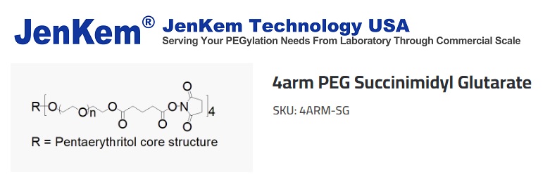 JenKem Technology’s 4arm PEG Succinimidyl Glutarate (a.k.a., 4S-StarPEG) derivatives can be crosslinked into degradable PEG hydrogels. 4arm PEG Succinimidyl Glutarate is a cleavable labile PEG linker. The cleavable ester linker between PEG and the NHS ester enables the feature of “degradable” hydrogels. PEG hydrogels have a variety of applications in medical devices and regenerative medicine, and are especially of interest for controlled release of drugs, for 2D and 3D cell culture, and for wound sealing and healing. JenKem Technology’s 4 arm PEGs are synthesized by ethoxylation of pentaerythritol. The number of ethylene oxide units in the PEG chain may not be equal for all arms. The total molecular weight reported for the JenKem multi-arm PEGs is the sum of the PEG molecular weights of each arm.