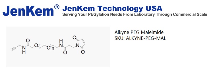 Alkyne PEG Maleimide (Propargyl Maleimide PEG, or Acetylene Maleimide PEG) is a high quality heterobifunctional PEG reagent from JenKem Technology with a standard quality specification of ≥95% Substitution.