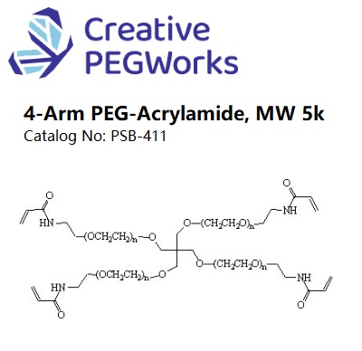 4-Arm PEG-Acrylamide is a multi-armed PEG derivative with acrylamide groups at each terminal of the four arms connected to one pentaerythritol core. The 4arm-PEG acrylamide can be used for radical initiator or UV light induced polymerization to synthesize PEG hydrogel. 4-Arm PEG-methacrylamide is provided through our custom synthesis service. 4-Methoxyphenol or MeHQ at ~ 200 ppm is added as inhibitors.