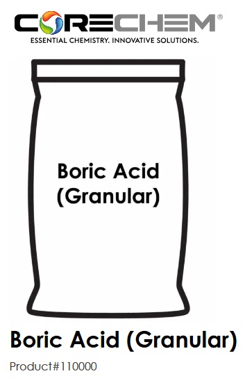 Description:Boric Acid is a weak acid that appears as white crystals (like table salt). It is a compound of boron, oxygen, and hydrogen. It is soluble in water and has no odor. CORECHEM is a supplier/distributor of Boric Acid in bulk package sizes. Buy Boric Acid Granular in bags or pallets.