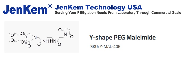 Y-shape PEG Maleimide from JenKem Technology is a thiol reactive branched 2arm PEG derivative, reacting with thiol groups at pH 5.0-6.5. JenKem proprietary Y-shape PEGs are more selective than linear PEGs, due to their sterically bulky structure.