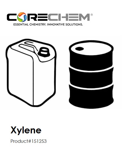 Xylene is a clear, colorless aromatic solvent with a characteristic odor. It is a mixture of m-Xylene, p-Xylene, Ethyl Benzene, and o-Xylene. It is a slightly greasy liquid and insoluble in water. This product is industrial-grade material. CORECHEM is a supplier/distributor of Xylene in bulk package sizes. Buy Xylene in pails or drums
