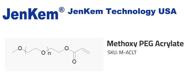 Methoxy PEG Acrylate (M-PEG Acrylate, or Acryl PEG) from JenKem Technology is a thiol-reactive PEG, reacting with sulfhydryl groups via Michael addition reactions. Acrylate groups are typically involved in vinyl photopolymerization or co-polymerization. Methoxy PEG Acrylate is available with MW 5,000 (M-ACLT-5000) and MW 20,000 Da (M-ACLT-20K), in 1g and 10g packing sizes. JenKem Technology provides repackaging services for an additional fee, please contact us if you require a different package size than our catalog selection.