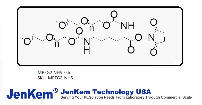MPEG2 NHS Ester from JenKem Technology is an NHS functionalized U-shaped branched 2ARM PEG, reactive towards the amino group of lysine