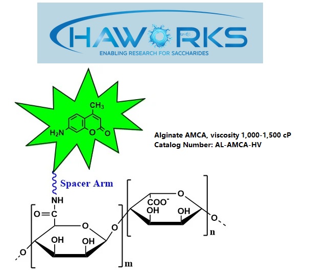 Description: Alginate is labeled with aminomethyl coumarin. Degree of substitution: 1.0 MOL % substitution or please contact Custom Service for higher Degree of substitution (DoS) and Alginate labeled with other types of fluorescent dyes or biomolecular probes may be offered through our custom synthesis.