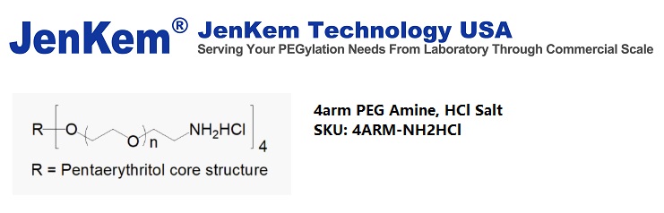 JenKem Technology’s 4arm PEG Amine derivatives can be cross-linked into PEG hydrogels. The HCl salt provides stability to the solid form of 4arm amine PEG. PEG hydrogels have a variety of applications in medical devices and regenerative medicine, and are especially of interest for controlled release of drugs, for 2D and 3D cell culture, and for wound sealing and healing. JenKem Technology’s 4arm PEGs are synthesized by ethoxylation of pentaerythritol. The number of ethylene oxide units in the PEG chain may not be equal for all arms. The total molecular weight reported for the JenKem multi-arm PEGs is the sum of the PEG molecular weights of each arm.