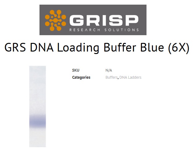 Categories:Buffers, DNA Ladders:GRS DNA Loading Buffer Blue (6X) is a pre-mixed Loading Buffer for Agarose and Polyacrylamide gel electrophoresis, containing Bromophenol Blue as tracking dye. EDTA is included to chelate Magnesium (up to 10 mM), stopping enzymatic reactions.